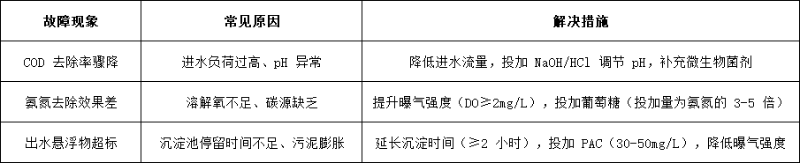•調(diào)節(jié)池管理:保持液位在設(shè)計(jì)值的 60%-80%,每周曝氣 2-3 次(每次 2 小時(shí)),防止污泥沉積發(fā)臭。