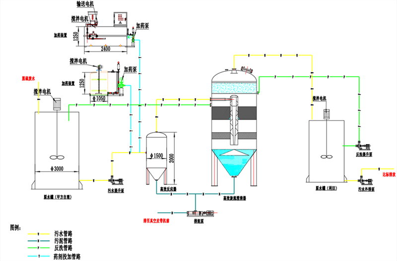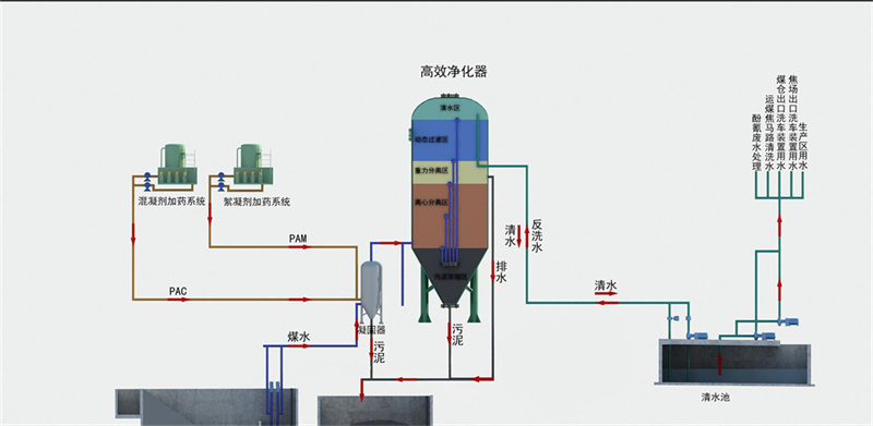 廢水進(jìn)入調(diào)節(jié)池,經(jīng)進(jìn)水泵抽至凈化器,同時利用負(fù)壓原理,將藥劑與廢水一并吸入管道中初步混合,進(jìn)入凈化器。在凈化器內(nèi)經(jīng)混凝反應(yīng)、離心分離、重力分離、動態(tài)過濾及污泥濃縮等過程從凈化器頂端排出凈化后的凈水,濃縮后的污泥從底部定時或連續(xù)排出。經(jīng)過一段時間運(yùn)行,開啟反沖洗泵進(jìn)行反沖洗。該產(chǎn)品取代了傳統(tǒng)的攪拌混凝反應(yīng)、沉淀、刮泥、提升、過濾、反沖、污泥濃縮等繁瑣的工藝流程及構(gòu)筑物體系。