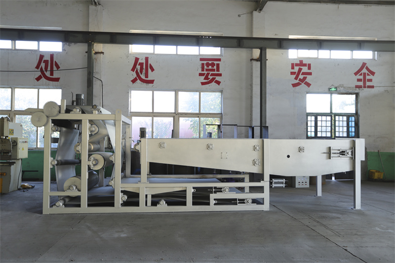 漿料經(jīng)布漿器均勻地分布在上網(wǎng)預(yù)脫水區(qū),后進(jìn)入重力脫水區(qū)。污泥在該區(qū)域內(nèi)主要靠自身的重力作用脫去大部分水份,使?jié){料失去流動(dòng)性,脫水濃度提至百分之3-百分之5。然后在中網(wǎng)上面繼續(xù)脫水,漿料進(jìn)入由中、下網(wǎng)形成的楔形交匯區(qū),即壓力脫水區(qū)。漿料在該區(qū)域受到中、下濾網(wǎng)的輕度擠壓,脫水至百分之15-百分之20左右,然后進(jìn)入加壓脫水區(qū)。壓力脫水區(qū)由不同直徑的脫水輥,使濾網(wǎng)的兩面在擠壓過程中迅速脫水。脫水壓輥的直徑由大逐漸變小的排列及濾網(wǎng)包角的改變,確保形成不斷增大的脫水壓力及相應(yīng)的剪切力,使?jié){料在脫水區(qū)反復(fù)變形并不斷脫除水份濃度百分之28以上形成泥餅,由刮泥機(jī)刮落。卸去漿料的濾網(wǎng)經(jīng)高壓水沖滌干凈后進(jìn)入下一個(gè)工作循環(huán)。